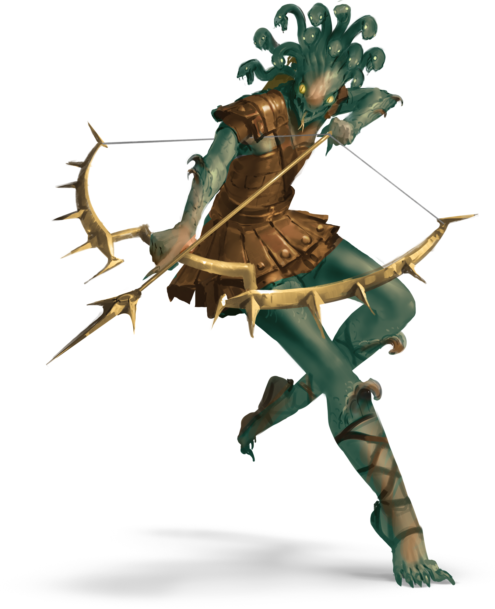 A snake-headed, scaled humanoid with a gilded bow, enraged that their peace has been disturbed.