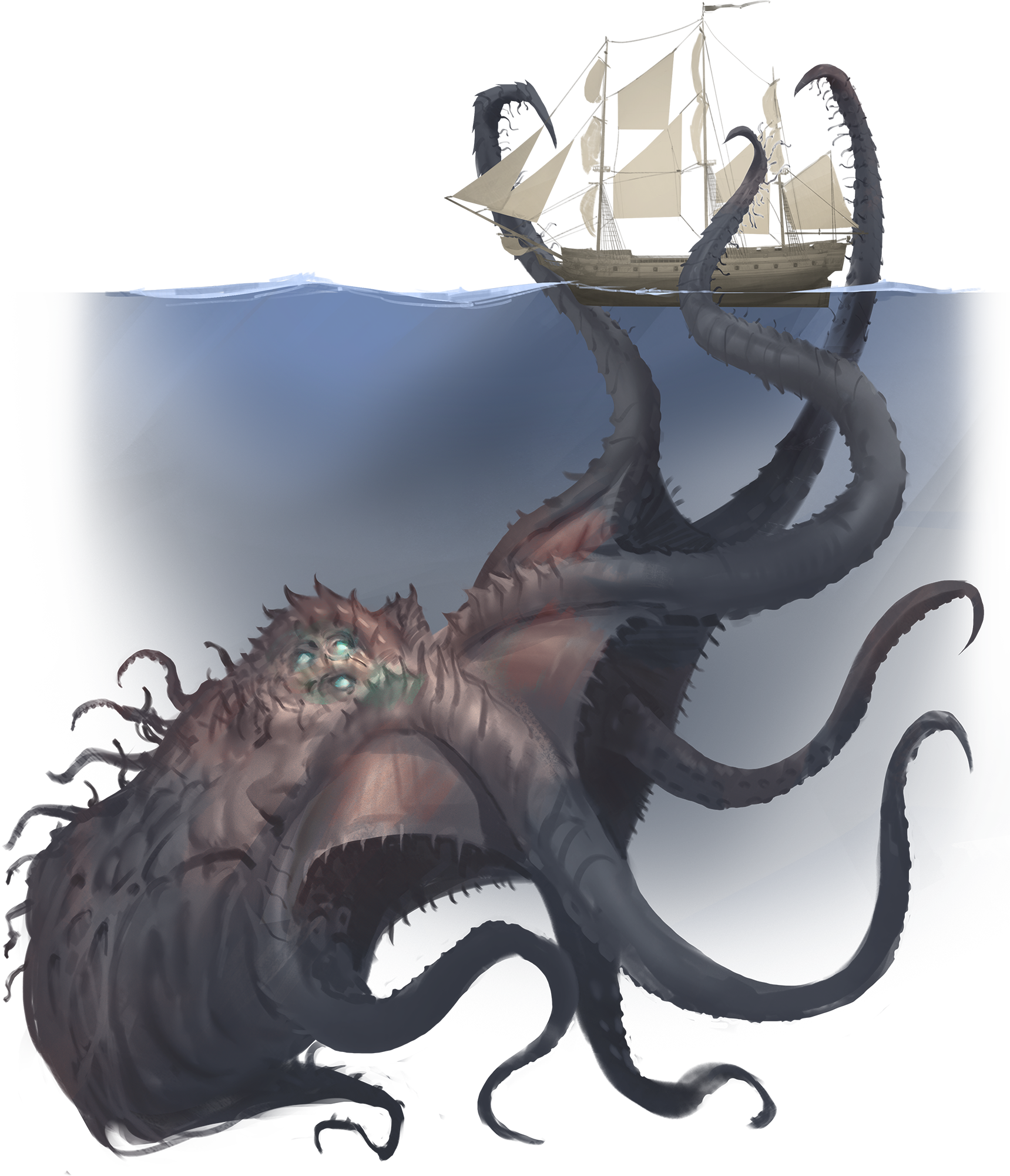 A legendary beast of the sea, bigger than the largest galleon, with sucker-laden tentacles and a terrifying maw.