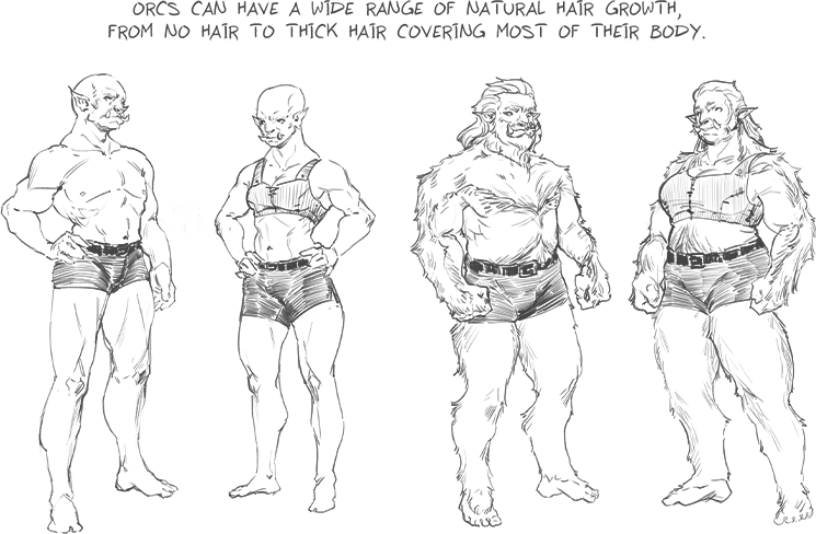 Orcs can have a wide range of natural hair growth, from no hair to thick hair covering most of their body.