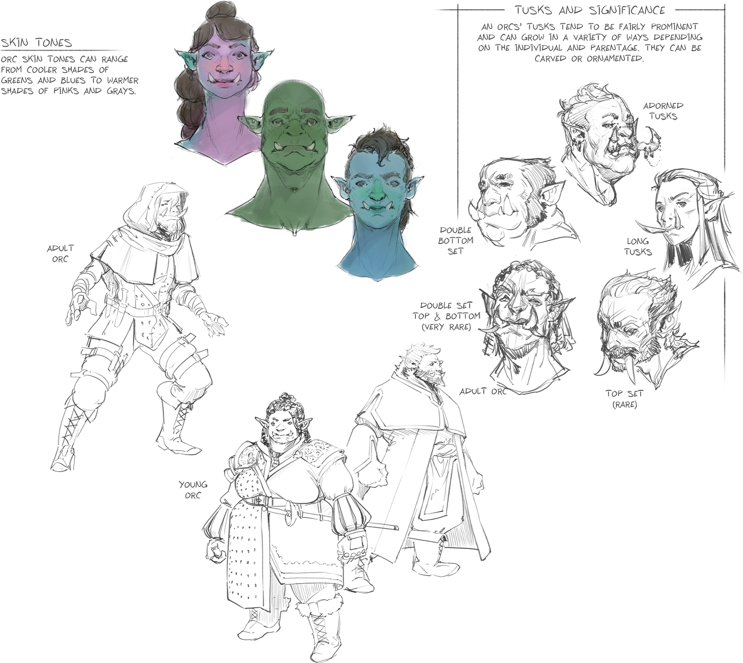 Tusks and Significance: An Orc’s tusks tend to be fairly prominent and can grow in a variety of ways depending on the individual and parentage. They can be carved or ornamented.