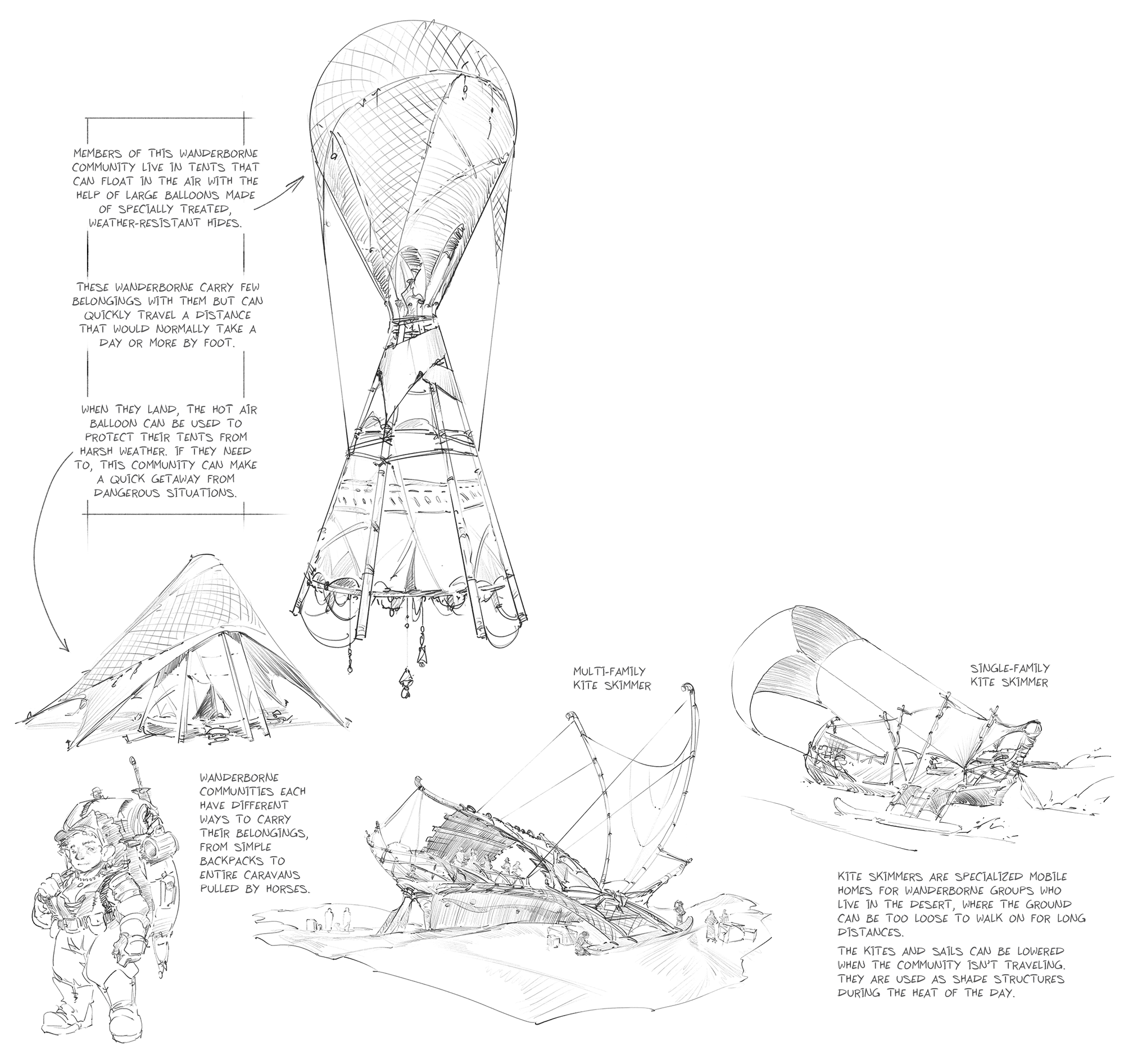 Members of this Wanderborne community live in tents that can float in the air with the help of large balloons made of specially treated, weather-resistant hides. These Wanderborne carry few belongings with them but can quickly travel a distance that would normally take a day or more by foot. When they land, the hot air balloon can be used to protect their tents from hard weather. If they need to, this community can make a quick getaway from dangerous situations. Wanderborne communities each have different ways to carry their belongings, from simple backpacks to entire caravans pulled by horses. Kite skimmers are specialized mobile homes from Wanderborne groups who live in the desert, where the ground can be too loose to walk on for long distances. The kites and sails can be lowered when the community isn’t traveling. They are used as shade structures during the heat of the day.